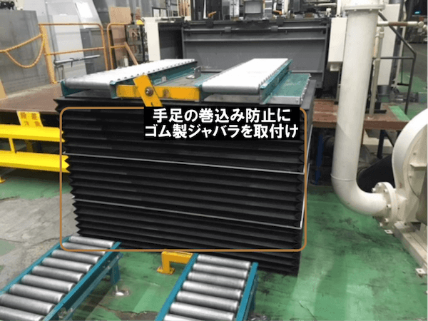 リフターの可動部にゴム製ジャバラを設計試作し、取り付けることで、手や足が巻き込まれるのを防止しました。 - 階段改造及び損紙散乱防止