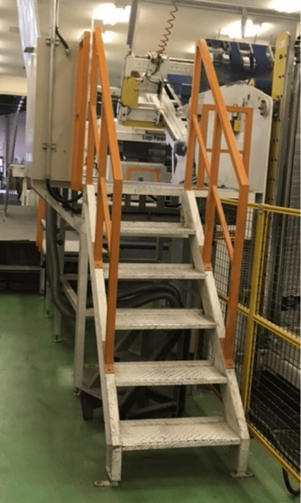 階段を5段から6段に改造することで、蹴上(1段当たりの昇降高さ)をJIS規格に適合させ、安全性を向上させました。また、階段上のステージから損紙が通路に落ちる際に、散乱しないように防護壁を設置しました。