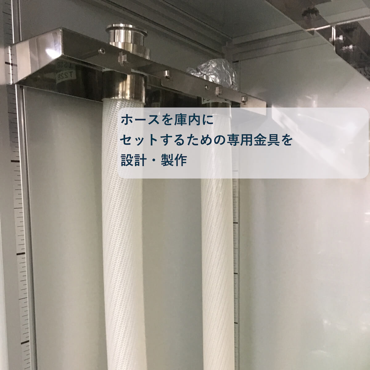 - ホースを庫内にセットするための専用金具も設計・製作。
